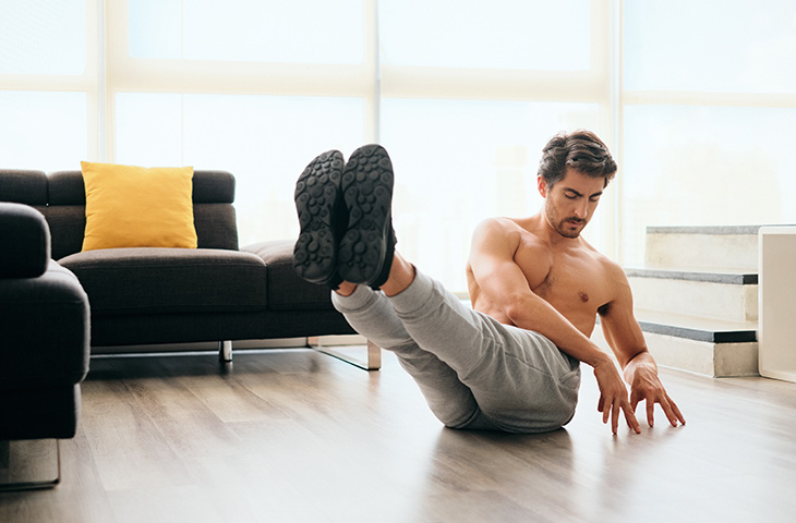 Flexiones: ahora tienes que ponerte en posición de flexión, apoyando las manos en el suelo con los brazos estirados y también los dedos de los pies. Presiona fuerte con las manos y sube el cuerpo, mantenido el tronco y las piernas rectas, en línea. Si para ti es complicado hacer este ejercicio, porque no estás acostumbrado, te recomendamos que apoyes las rodillas en el suelo, esto aliviará un poco el peso que debes levantar y será más fácil de hacer.