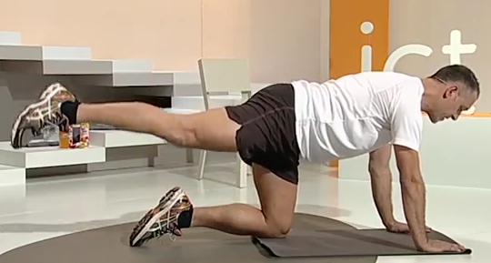Es muy importante que mantengas el cuello recto y la espalda derecha; para ello debes mantener también tus abdominales contraídos. La cadera, el muslo y la rodilla de la pierna levantada deben quedar alineados paralelos al suelo. Para darle más intensidad a las extensiones, coloca una pesa detrás de la rodilla de la pierna que estás levantando y repite el ejercicio con tres series de diez repeticiones.